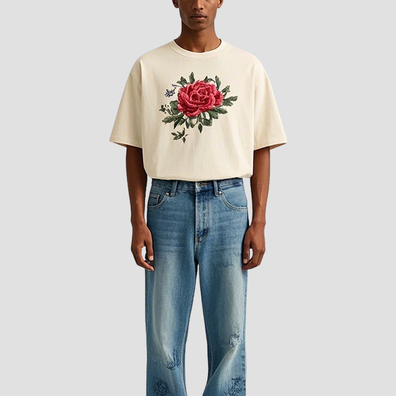 Single Rose Embroidery Exquisite Men’s Short-Sleeves