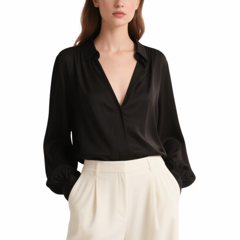 This women’s long-sleeved shirt is a wardrobe classic, combining practicality and style. Made from comfortable, skin-friendly fabric, it fits snugly without being constricting, ensuring a comfortable and relaxed feel. The classic lapel design creates a clean, defined neckline. Paired with long sleeves, it’s perfect for wearing alone in spring and autumn, or as a layer in winter, adapting to a variety of seasons and outfits.
