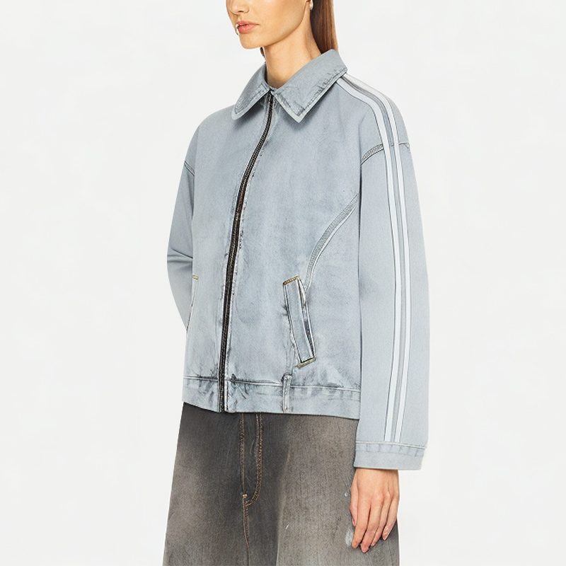 Sleeve webbing design: The webbing design on the sleeve injects a sense of sportiness and fashion into the jacket, breaking the monotony of the traditional denim jacket, adding uniqueness to the details, and enhancing personalized expression.