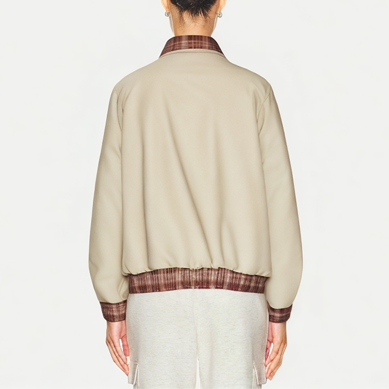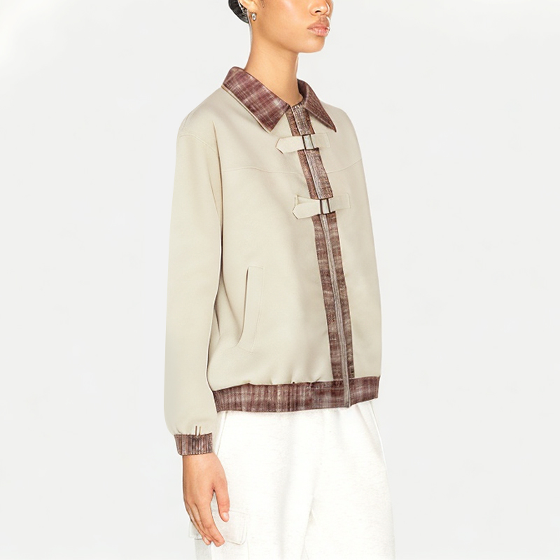 Cuff and hem design: The contrast design of the cuffs and hem echoes the plaid lapel, creating an overall harmonious and layered visual effect, adding to the unique personality of the jacket.