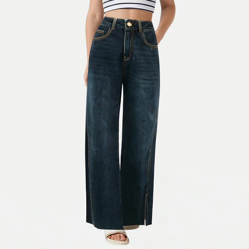 Split trouser legs: This design adds a modern touch to the classic wide-leg pants, while also better showing the shoes and creating a long-legged visual effect. The split design makes the pants more fluid when walking or moving, and looks more dynamic and fashionable.