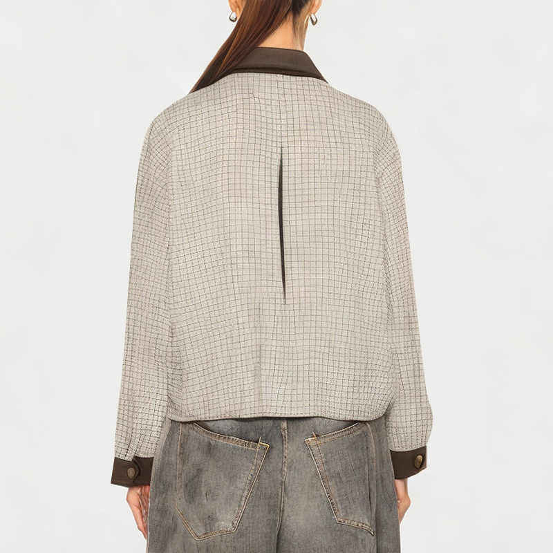 Lapel: The solid color collar design is simple and generous, forming a soft contrast with the plaid splicing.